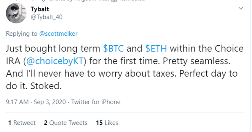 Je viens d’acheter à long terme des BTC et ETH dans la “Choice IRA” (@choicebyKT) pour la première fois. Assez transparent. Et plus jamais je me soucierai des impôts. Journée parfaite pour le faire. Ravi.