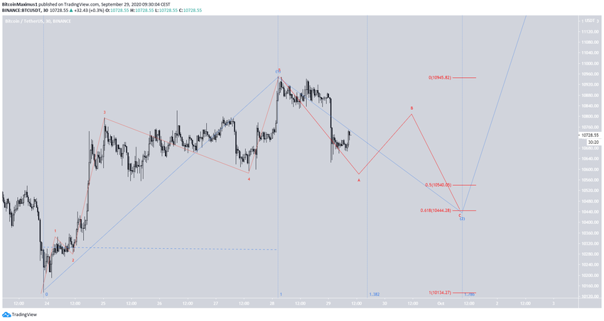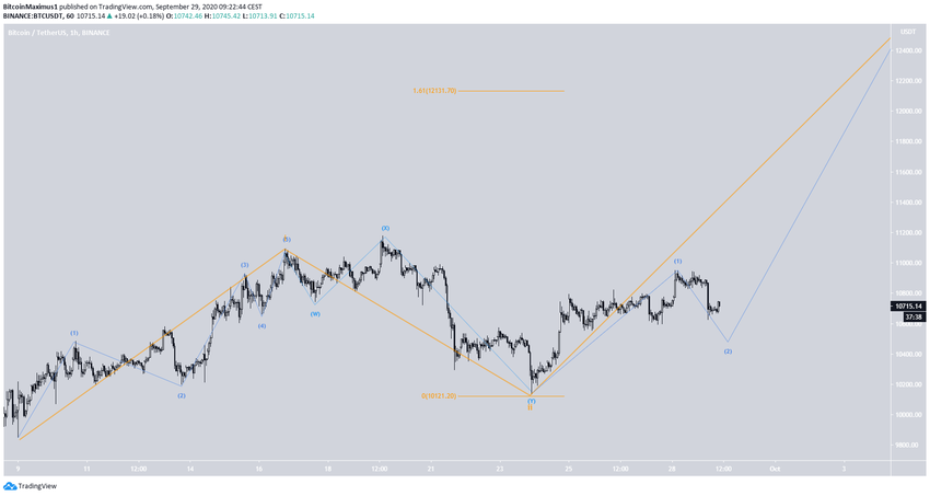 Il est probable que le 9 septembre, le BTC ait démarré une impulsion haussière (en orange ci-dessous). Il semble en avoir déjà complété les vagues 1 et 2, et a probablement entamé la troisième vague.