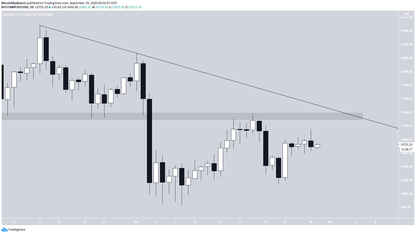 Le cours de Bitcoin suit une ligne de résistance descendante depuis son sommet local à 12 473$ du 17 août. Il a validé cette résistance à deux reprises.