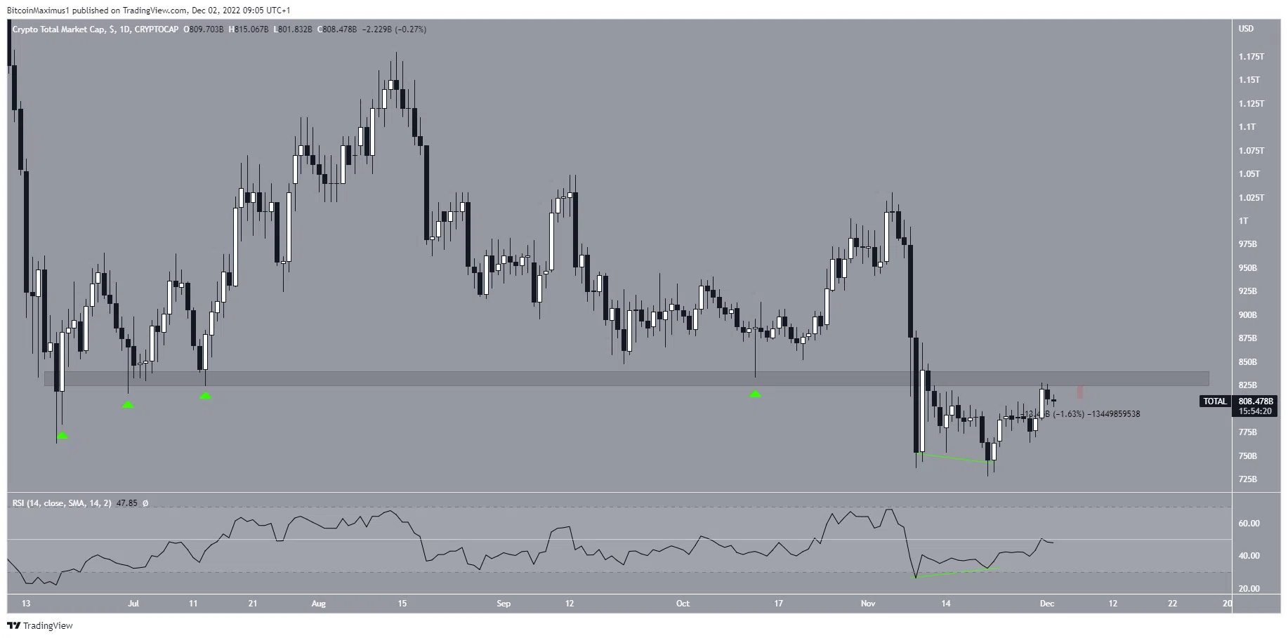 La capitalisation totale du marché des crypto-monnaies (TOTALCAP) a baissé de 1,5 % le 1er décembre. Le cours a subi un rejet tout près de la zone de résistance à long terme de 830 milliards de dollars. Cette zone avait fourni un support en juin et juillet (flèches vertes) et s’est depuis transformée en résistance.