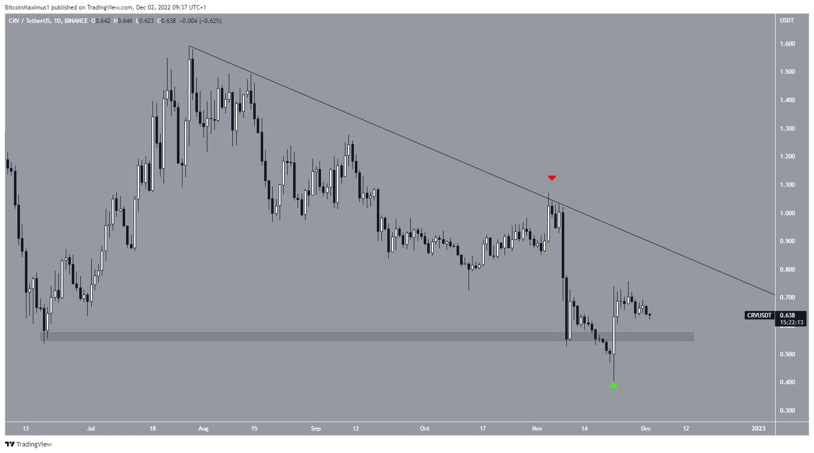 Le cours de la crypto CRV décline sous une ligne de résistance descendante depuis le 28 juillet. Cette ligne a rejeté le cours le 5 novembre et a entraîné une forte baisse, culminant avec un point minimum de 0,40 $ le 22 novembre.