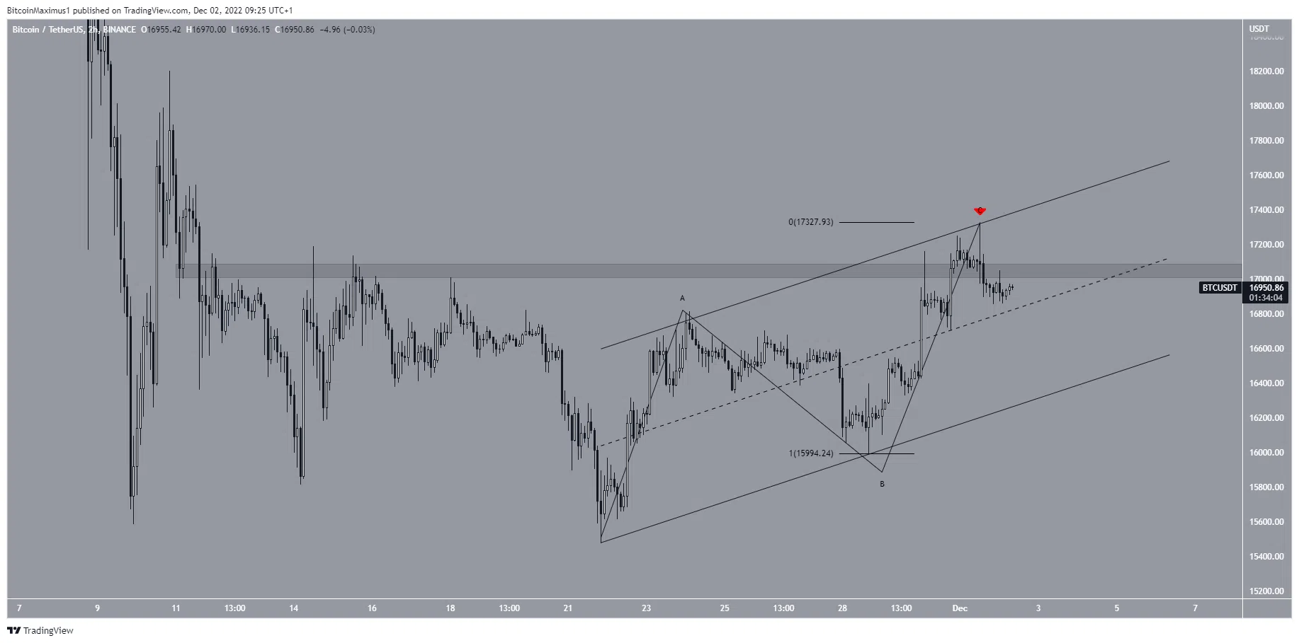 De plus, le BTC est tombé en dessous de la zone de résistance de 17 050 $. Enfin, son mouvement à l’intérieur du canal ressemble à une structure corrective en A-B-C, et au sein de laquelle les vagues A:C présentent un rapport de 1:1.