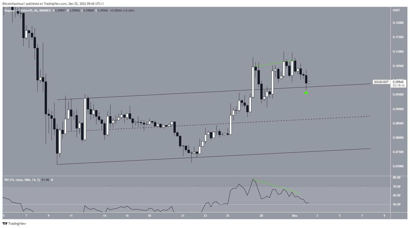 Contrairement à Bitcoin, le cours Dogecoin a dépassé une figure de canal parallèle ascendant le 26 novembre. Cependant, il a ensuite diminué, ce qui a été précédé par une divergence baissière du RSI sur deux heures (ligne verte).