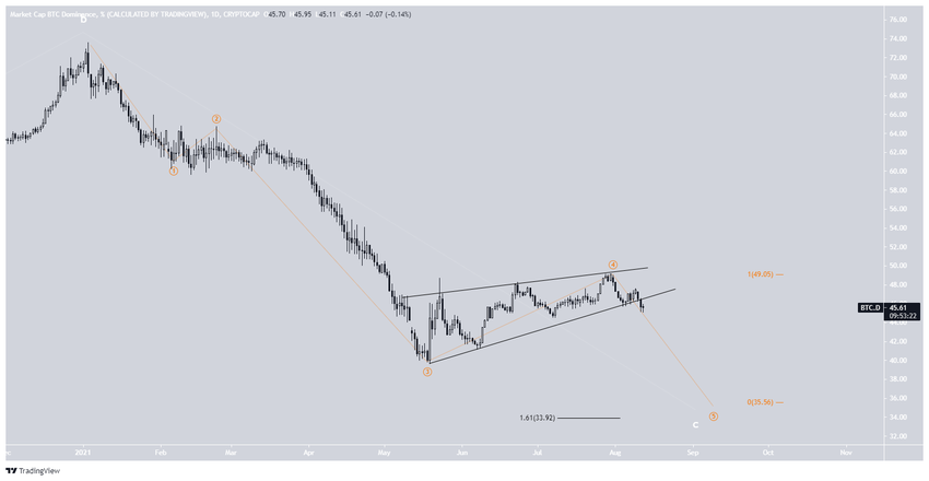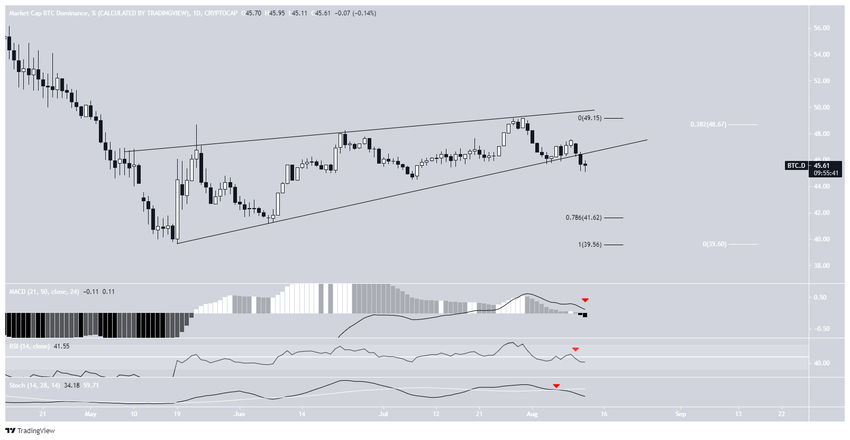 Le graphique quotitien est pareillement baissier. Depuis le rebond susmentionné, le BTCD montait au sein d’une figure de biseau ascendant. Le 10 août, cela dit, il est passé sous cette figure et se trouve depuis en déclin.