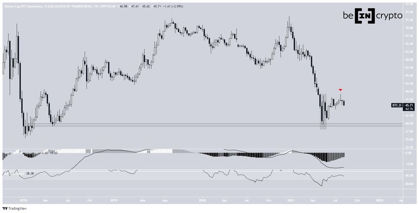Bien qu’un support mineur se trouve à 41,60%, il serait plus logique que le BTCD retourne à la zone de support de long terme des 39,50%.
