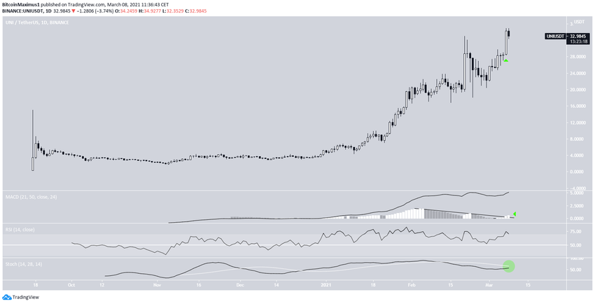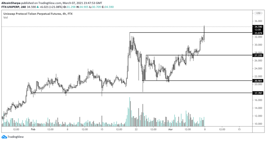 Le token UNI d’Uniswap a atteint un nouveau sommet record de 34,92 dollars ce 8 mars 2021.