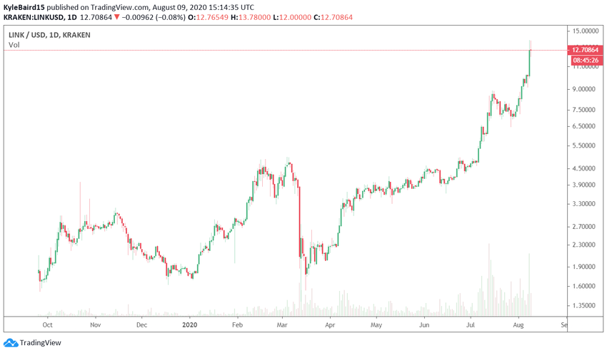 Le cours de Chainlink entre en territoire encore inexploré. Il a actuellement dépassé Litecoin en termes de capitalisation boursière et fait maintenant concurrence à Bitcoin Cash pour une place dans le top 5.