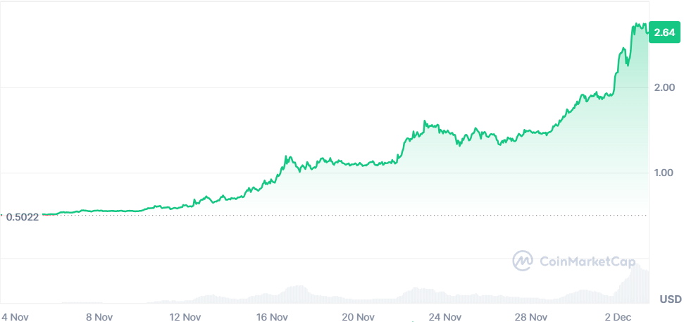 Avec la frénésie autour d’un potentiel ETF XRP imminent, les achats n’ont pas manqué. Le cours du XRP est monté en flèche en novembre, affichant une hausse de pas moins de 430 % au cours des 30 derniers jours. Ce faisant, l’altcoin a atteint des sommets qu’il n’avait pas retrouvé depuis 2018.
