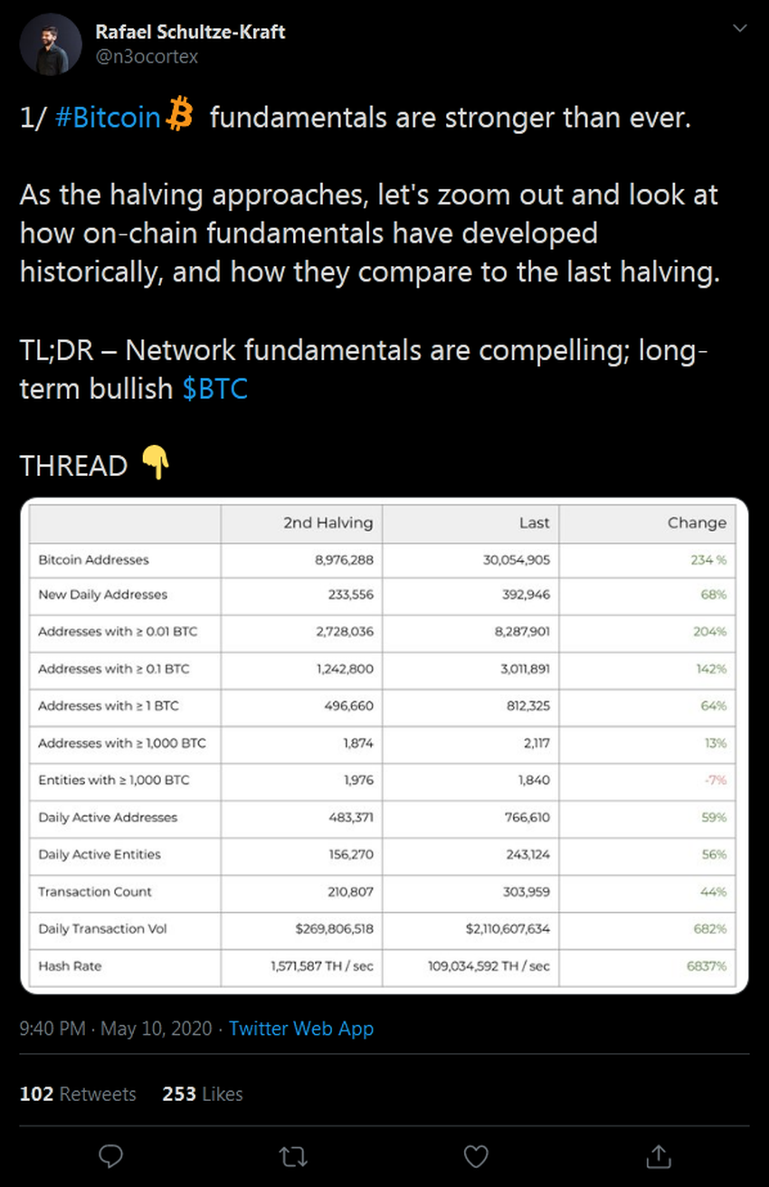 Tweetant le 10 mai 2020, Rafael Schultze-Kraft (@ n3ocortex), le CTO et co-fondateur de la plateforme de crypto-analyse Glassnode, a souligné l’amélioration des éléments fondamentaux du Bitcoin depuis la réduction de moitié de 2016.