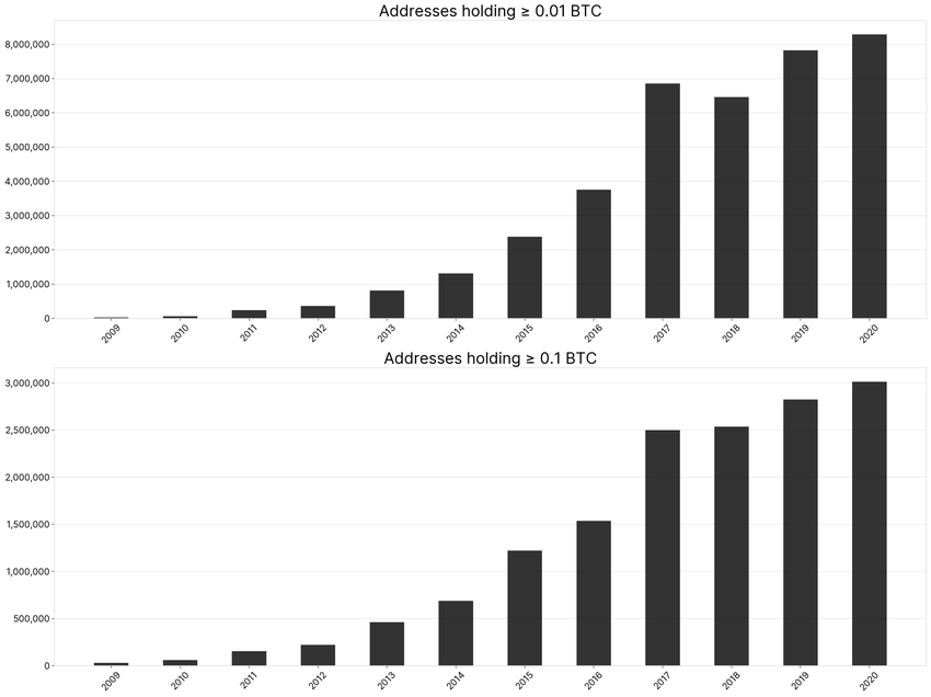 Du côté de la propriété, il y a également une augmentation significative de la participation au détail et à la «grosse somme». Le nombre d’adresses Bitcoin avec 0,01 BTC et 0,1 BTC continue d’augmenter quotidiennement. Les propriétaires de Bitcoin au détail seraient “ empilables ” par tous les moyens nécessaires, certains dépensant même leurs chèques de relance de 1200 $ aux États-Unis.
