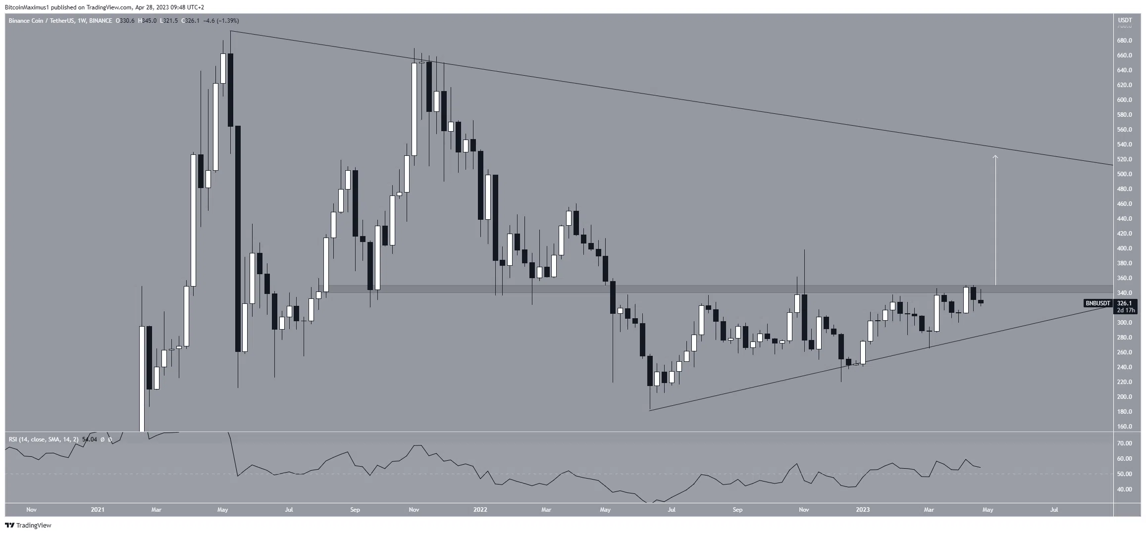 Si le cours BNB venait à dépasser cette zone, il pourrait alors atteindre un sommet de 510 $, légèrement sous son sommet historique et au niveau d’une ligne de résistance descendante de long terme.