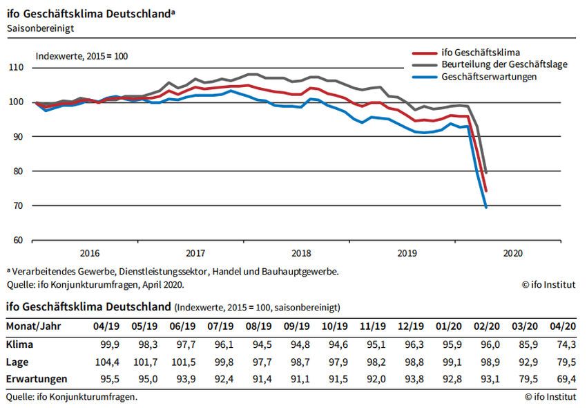 Il a été rapporté le 24 avril 2020 que la lecture de l’indice IFO allemand avait chuté à certains de ses points les plus bas jamais enregistrés.