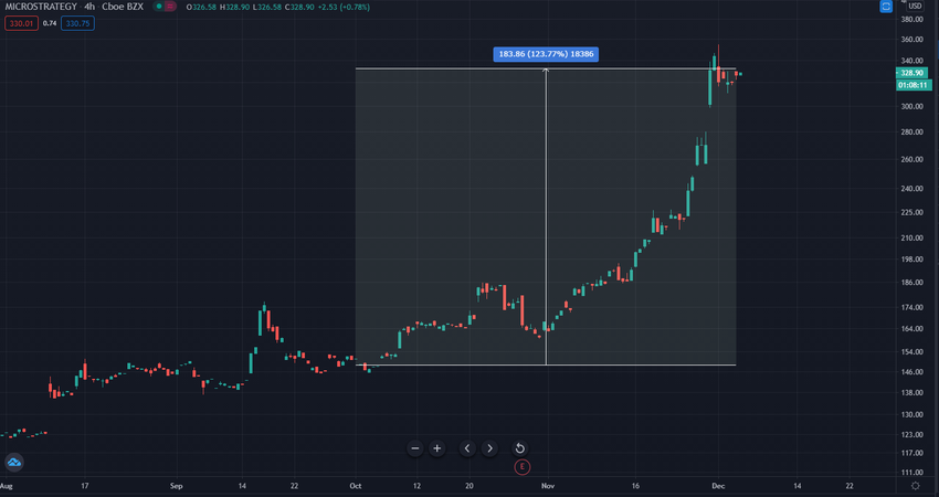 Jusqu’à présent, les investisseurs de ces entreprises ont été extrêmement bien récompensés. MicroStrategy est en hausse de plus de 120% depuis début octobre, avec un cours de bourse actuel d’environ 330 $.