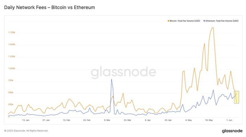 Le 6 juin, le total des frais sur le réseau de l’Ethereum ont dépassé ceux du Bitcoin. Le 6 et le 7 juin, ses transactions à la journée ont affiché environ 502 000$ et 546 000$ respectivement. De son côté, le Bitcoin a enregistré des frais de 310 000$ et 252 000$.