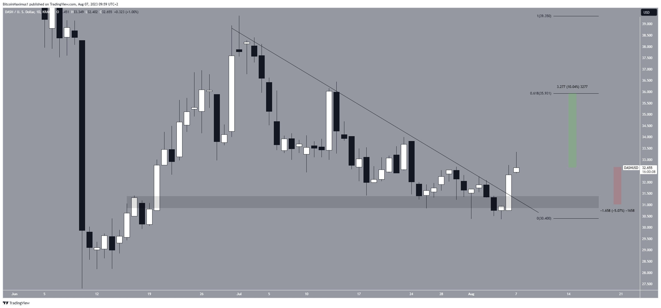 Le prix du DASH a baissé sous une ligne de résistance descendante depuis le 1er juillet. La baisse a culminé avec un plus bas de 30,35 $ le 5 août.