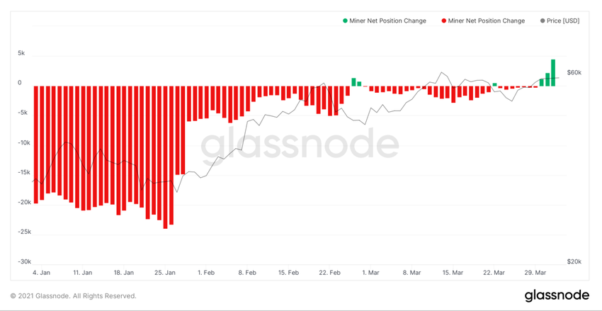 Les mineurs sont confrontés à un changement de position net positif, selon les données de Glassnode. La plupart préfère toujours conserver l’actif au lieu de le vendre.