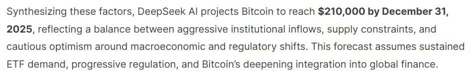SponsoredMalgré les secousses provoquées par cette IA sur le prix du BTC ces derniers jours, ce n’est pas pour autant que la relation est mauvaise entre DeepSeek et la plus grande crypto au monde. Les prédictions effectuées sur le prix de l’actif concernent l’année 2025 et s’attardent jusqu’au 31 décembre. Parmi les principaux catalyseurs de prix à prendre en compte, DeepSeek pense comme de nombreuses IA et de nombreux analystes à l’évènement de halving Bitcoin (avril 2024), l’impact des ETF Bitcoin ou encore les politiques régulatrices mises en place.