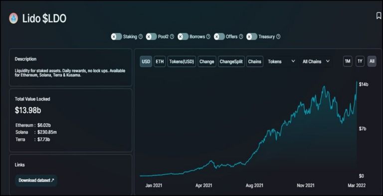 En tant que token ERC-20 lancé sur la blockchain Ethereum en 2020, Lido a connu une forte croissance. Après son déploiement sur les réseaux blockchain Terra (LUNA) et Solana (SOL) en 2021, la TVL du protocole est passée de 743 millions de dollars à la fin du premier trimestre 2021 à 11,74 milliards de dollars en fin décembre 2021.