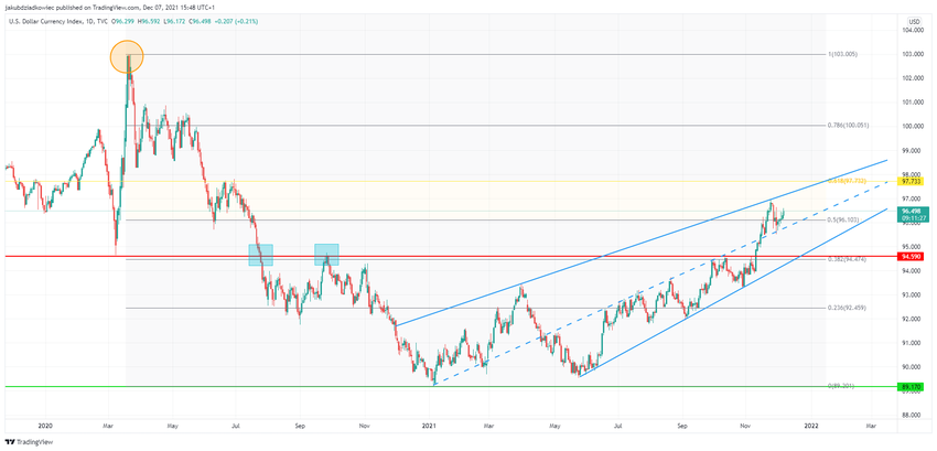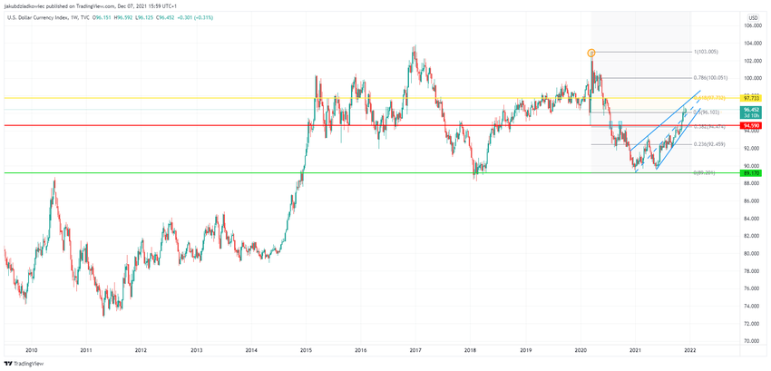 Toute l’année 2021 a été principalement marquée par une consolidation du DXY dans la zone allant de 89,1 à 94,5. Cependant, il y a environ un mois, soit début novembre 2021, on a observé un passage du cours au-dessus de la ligne rouge, puis à une poursuite de la tendance haussière.