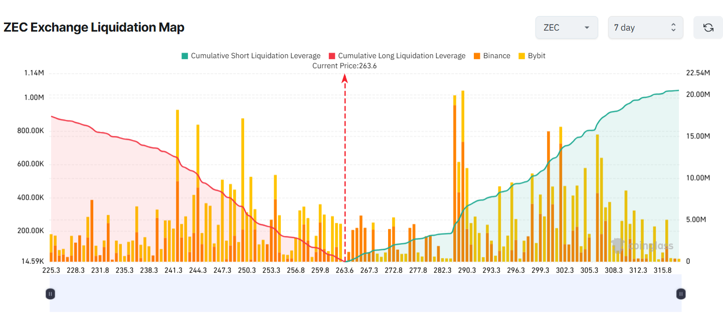 Une poussée au-delà de 315 $ liquiderait environ 20 millions de dollars de positions courtes, tandis qu’un repli vers 227 $ menacerait 17 millions de dollars de longues. Malgré la volatilité globale, ZEC reste pour l’instant dans un équilibre précaire.