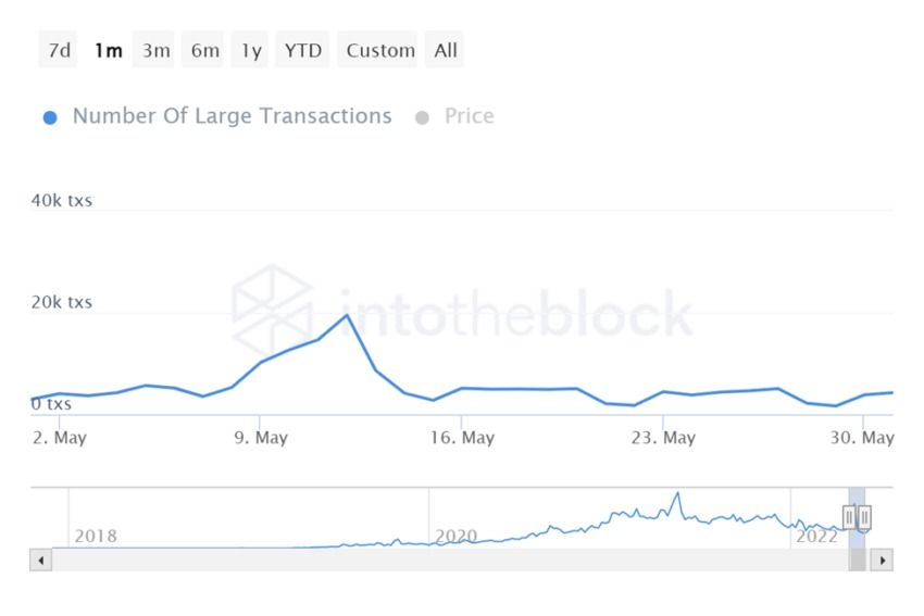 Le 12 mai, le nombre de grandes transactions d’USDT a atteint un sommet mensuel de 19 510. Ce jour-là, l’actif s’échangeait à 0,9747 $.