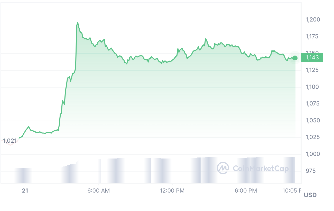 SponsoredEn effet, le cours du jeton MKR est passé de 970 $ à 1196 $ en l’espace de 24 heures. C’est la première fois depuis le début de l’année que le MKR atteint ce niveau sur les marchés. Les données de volume confirment cette solide performance de Maker. Selon Coinmarketcap, le volume des transactions sur cette cryptomonnaie s’élève à 171 millions de dollars, soit une augmentation quotidienne de 75,86 %.