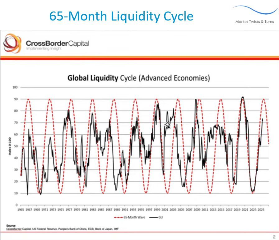 Ce mois de novembre 2025, le GLI est proche de 75 et augmente d’environ quatre points par mois. Ce rythme s’explique par une hausse d’environ 18 à 20 points de l’indice au cours des cinq derniers mois. Les pics du GLI se forment généralement autour de 90, ce qui place le prochain pic de liquidité entre mars et mai 2026.
