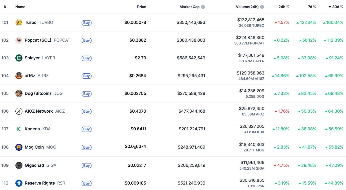 Si l’on regarde encore au-delà, le constat est très similaire avec un tas de revalorisation, mais “seulement” deux cryptomonnaies qui gagnent plus de 100 % en un mois. Alchemist IA (ALCH) et Cetus Protocol (CETUS) sont les deux pépites de la semaine pour les altcoins situés entre la 201ème et 300ème position par capitalisation boursière avec 164 % et 116 % de gains.