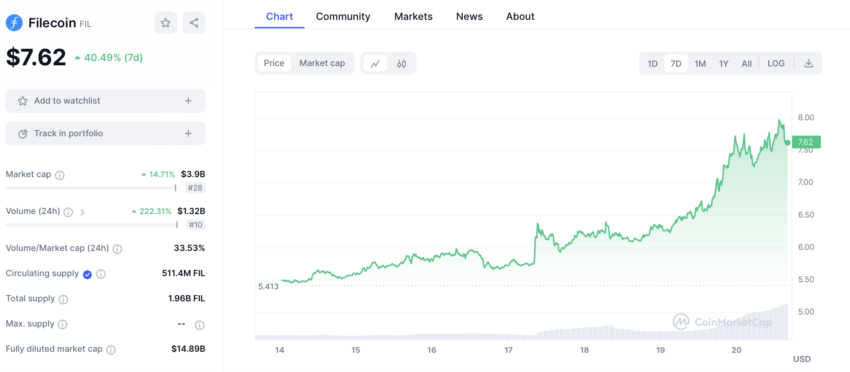 Au cours des sept derniers jours, Filecoin a vu son prix augmenter de 43,25%. Sur une base quotidienne, la valeur de son token a grimpé de 18,32%. Ce qui est particulièrement notable avec Filecoin, c’est l’intérêt croissant des investisseurs pour le token. D’après les informations de Coinmarketcap, le volume d’échange sur FIL a bondi de près de 124,67%, atteignant 1,2 milliard de dollars.