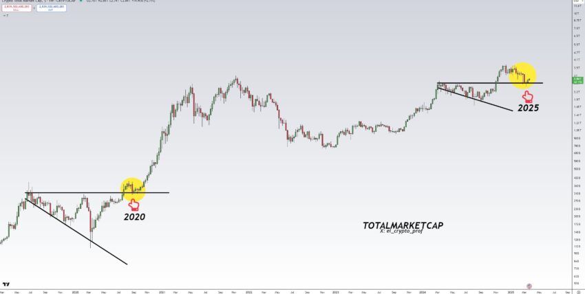 Enfin, Moustache souligne une analogie frappante avec le setup de 2020 : une figure de compression suivie d’un breakout haussier sur la market cap totale des altcoins par rapport au BTC. Le parallèle avec 2025 renforce l’idée d’un changement de cycle déjà amorcé, et qui pourrait s’accélérer après la séquence macro du 2 avril. En clair, si les fondamentaux globaux ne viennent pas perturber la trajectoire, Bitcoin est peut-être en train de préparer sa prochaine phase de price discovery.