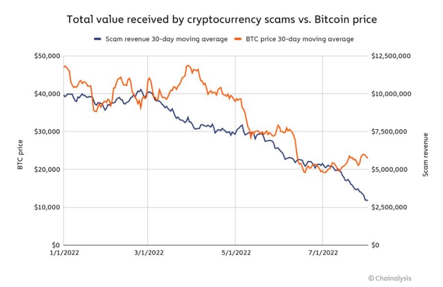 D’après le dernier rapport de Chainalysis, les revenus des scams crypto auraient eux aussi souffert de la baisse de valeur de Bitcoin. Depuis le début de l’année 2022, environ 1,6 milliards de dollars auraient donc été récupérés par les criminels, soit 65% de moins qu’au mois de juillet 2021.