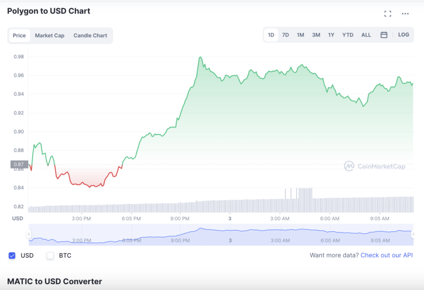 En moins de 24 heures, MATIC est passé de 0,8952 $ à 0,953 $ avec un pic journaliser de 0,9789 $. Quelques heures plus tôt, Instagram a annoncé que la plateforme soutiendrait la marketplace NFT de Polygon grâce à un partenariat entre les deux entreprises.