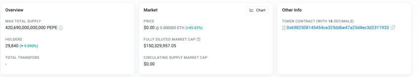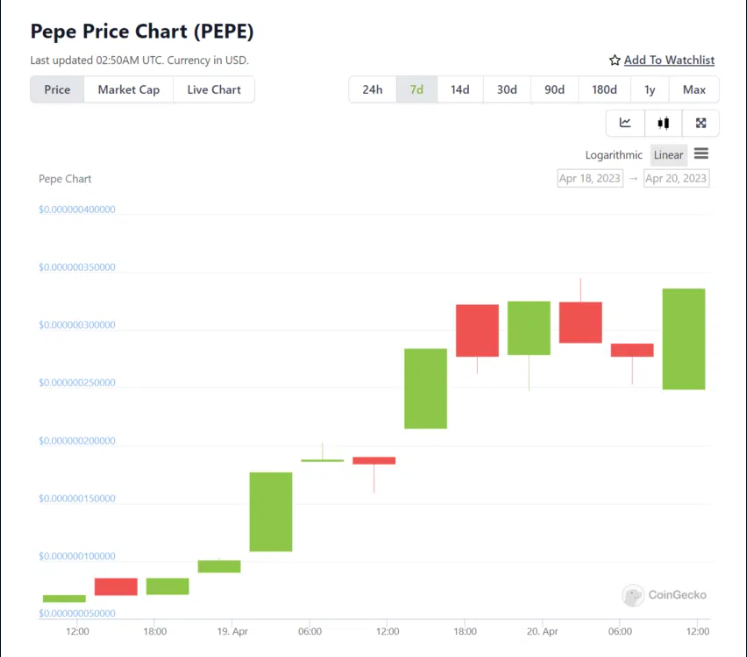 Lancé dimanche, PEPE a atteint une capitalisation boursière de 33 millions de dollars mardi. De même, son volume d’échange a atteint 30 millions de dollars sur le DEX Uniswap. En conséquence, son cours a augmenté de 21 000 %.
