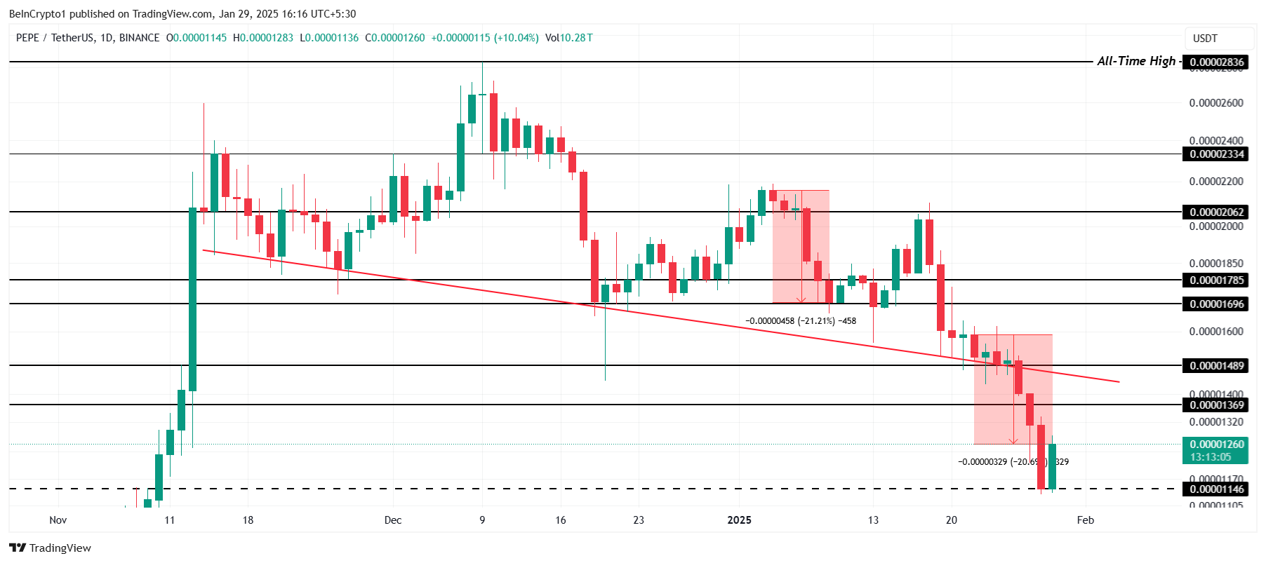 Malgré ses pertes récentes, PEPE est en hausse de 10 % sur la journée du mercredi 29 janvier, se négociant actuellement à 0,00001146 $. Ainsi, le meme coin a probablement atteint son creux local, suggérant maintenant un risque de baisse limité. Si cela se confirme, PEPE pourrait finalement amorcer un mouvement de hausse, ce qui en ferait un point d’entrée attractif pour les traders.