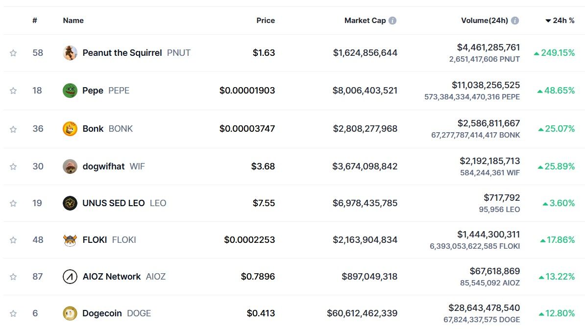 Ces derniers ne sont pas restés de simples spectateurs avec notamment le PNUT, meilleur performeur de la journée et de la semaine. Avec son listing sur Binance de ce début de semaine, le PNUT (Peanut the Squirrel) multiplie les bonnes performances. Après une hausse de plus de 1 000 % hier, PNUT fait encore les grands titres aujourd’hui.