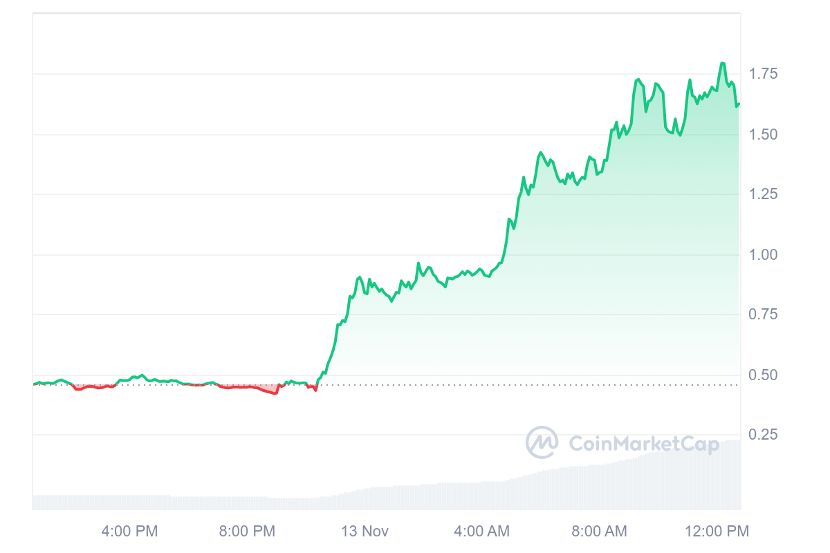Ce mercredi, le cours du PNUT s’est fortement revalorisé, avec une hausse de 254 % en moins de 24 heures. Par la même occasion, la nouvelle coqueluche au niveau des meme coins a réussi à signer un nouvel ATH à 1,81 $. Au moment de rédaction, le cours du jeton est légèrement retombé, avec un prix de négociation de 1,62 $.