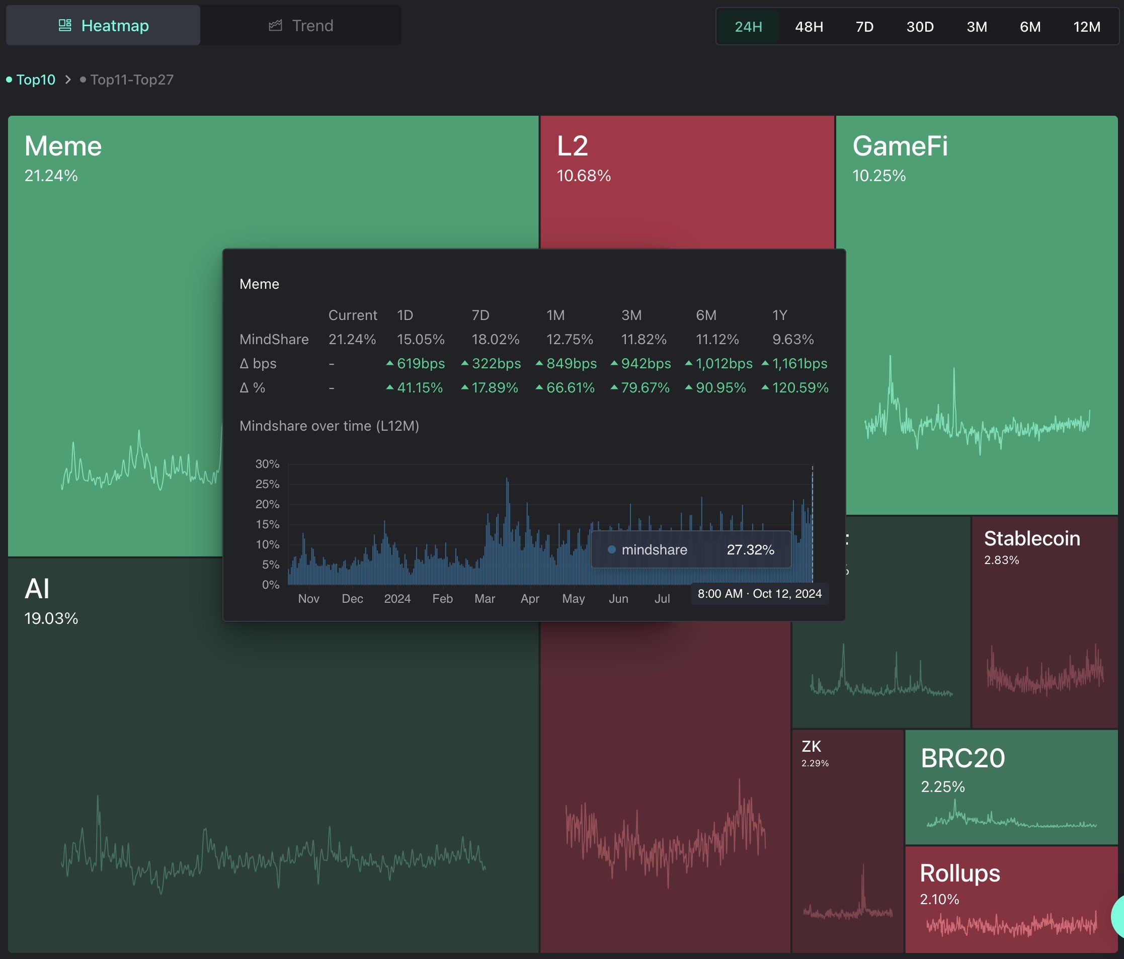 Selon l’investisseur Miles Deutscher, les discussions répandues au sujet des meme coins sur les plateformes de médias sociaux, de YouTube à X, contistuent un signe d’alerte. Les données de Kaito indiquent que le “mindshare” des meme coins a atteint un nouveau sommet à 27,32 %. Le “mindshare” est un indicateur qui mesure la proportion d’attention qu’un sujet attire au sein la communauté.
