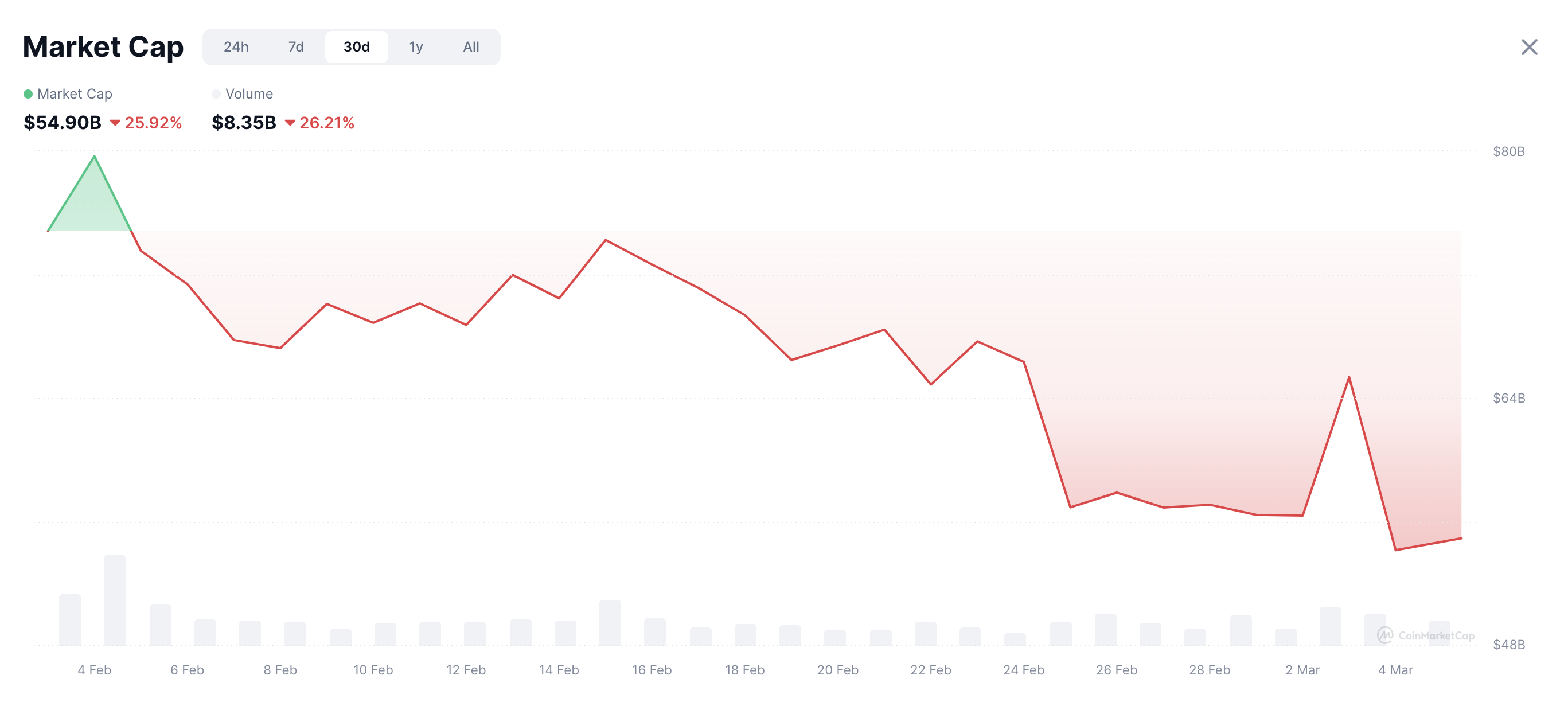 Au 5 mars, les dernières données en date montrent que la capitalisation boursière totale de la narrative a chuté de 54 milliards de dollars. Cela représente une baisse de 56,8 % par rapport à son pic de 125 milliards atteint le 5 décembre 2024.