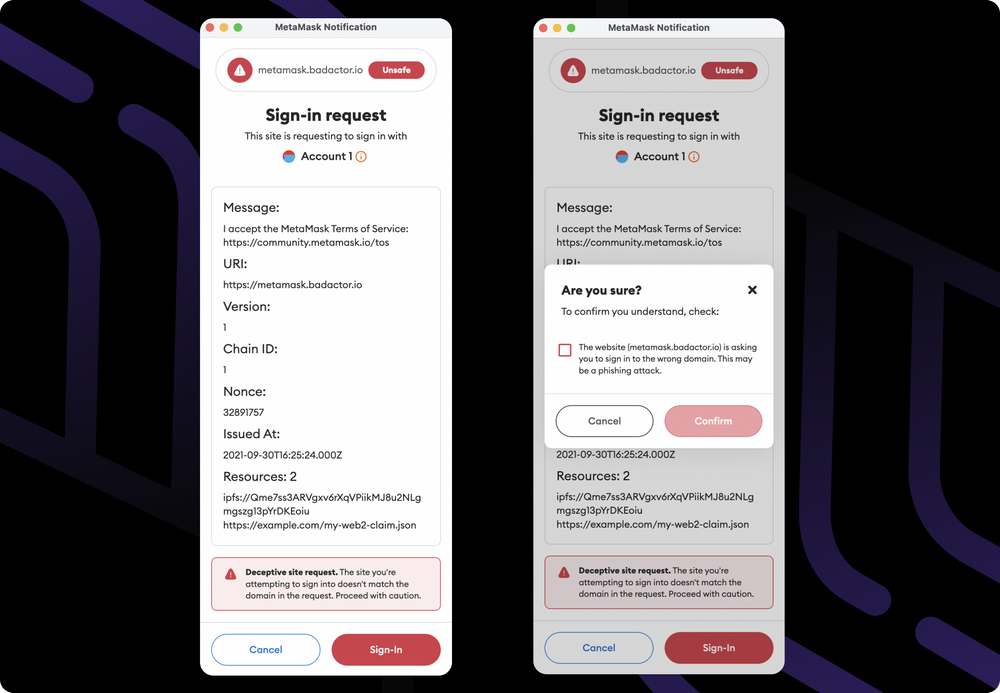 SponsoredMais ce n’est pas tout ! Avec sa nouvelle fonctionnalité, MetaMask scanne chaque site et diffuse un message d’alerte si l’URL du site sur lequel l’utilisateur veut se connecter et son domaine ne correspondent pas. De quoi permettre de réfléchir à deux fois avant d’approuver les transactions et d’être informé d’une 😬 tentative de phishing.