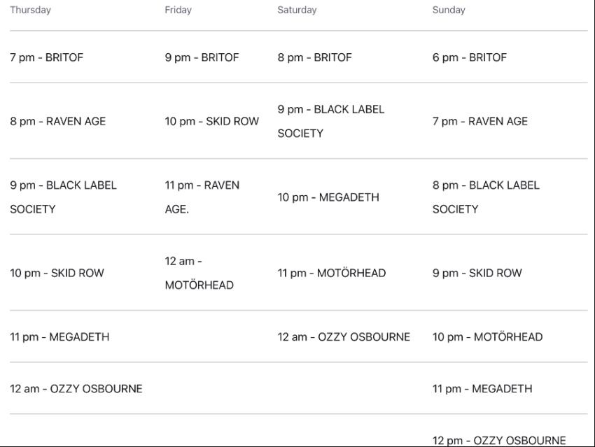 Voici un aperçu du programme d’Ozzfest, le célèbre festival de musique métal lancé par le couple Ozzy et Sharon Osbourne :