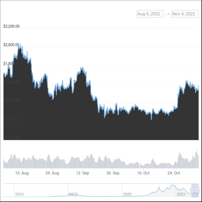 Au moment où nous écrivons ces lignes, Ethereum s’échange à 1 549 $. Après un bref rallye haussier, l’actif est en baisse sur le mois.