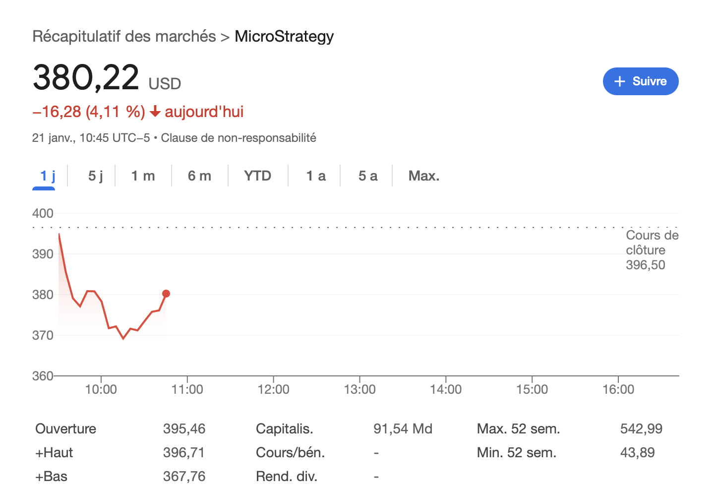 L’annonce tombe alors que le cours du Bitcoin a subi un léger repli, affecté pas l’omission de Trump de la crypto lors de son investiture. Malgré cet achat massif, MicroStrategy débute mal à Wall Street, avec une baisse de 4,11 % de son action au moment d’écrire ces lignes.