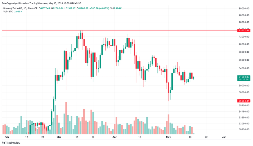 À la suite de ces événements, le marché a toutefois connu une période de stagnation. Cela s’explique en grande partie par la baisse de l’optimisme quant à une éventuelle réduction des taux d’intérêt par la Réserve fédérale (Fed), influencée par de solides indicateurs économiques. Ainsi, depuis la fin du mois de février, le cours de Bitcoin a fluctué entre 56 500 et 73 700 dollars.