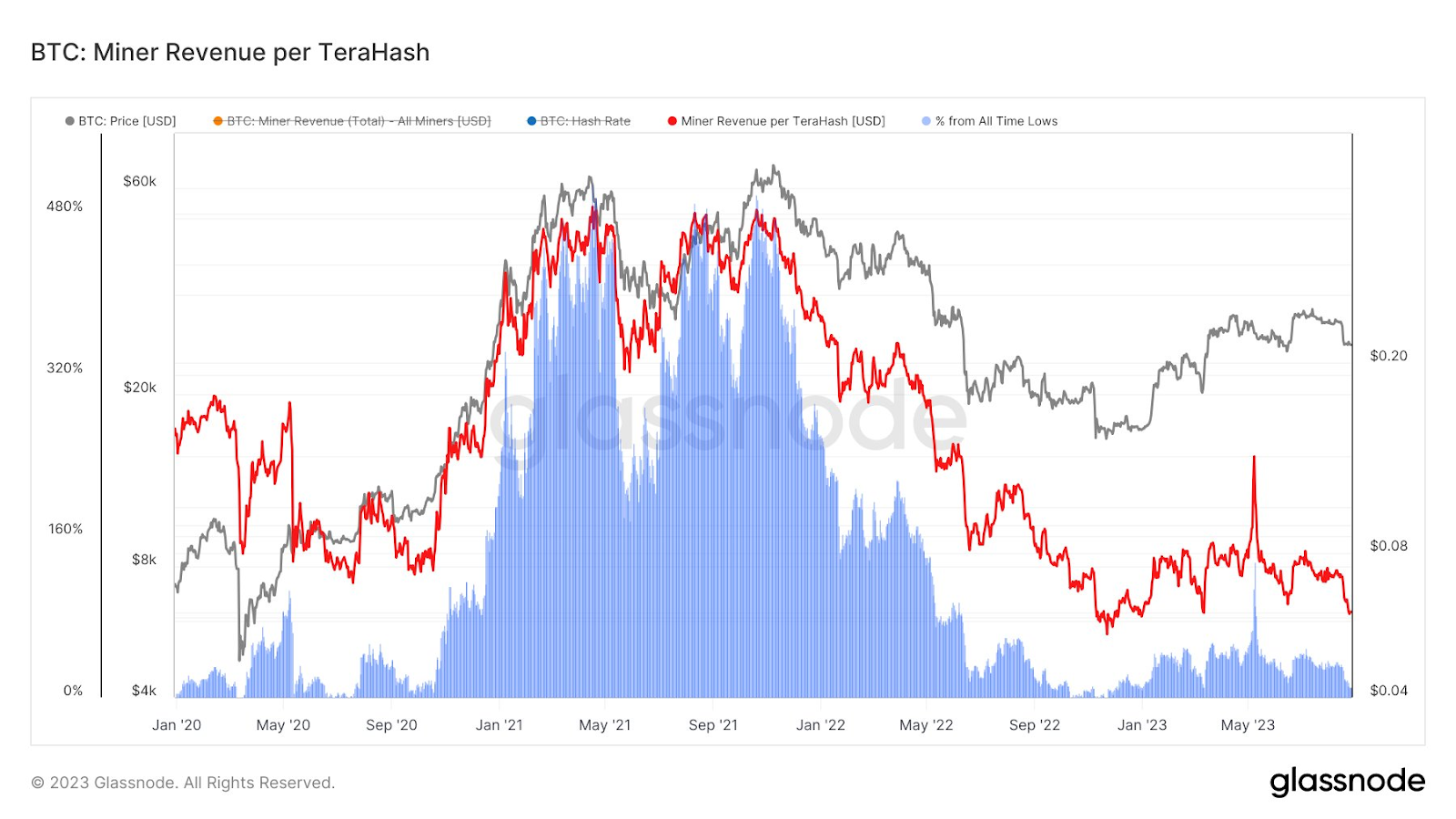 D’après Dylan LeClair, les revenus de minage Bitcoin par terahash sont proches de leur creux historique. Comme le montre la capture d’écran ci-dessous, l’indicateur approche à grands pas de son niveau de novembre 2022.