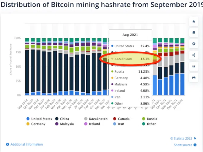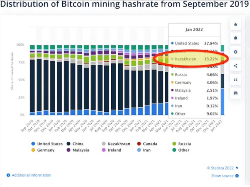 Depuis le 22 janvier, le Kazakhstan a connu des pannes d’électricité, une taxe de 1 à 2,5 c/KWh sur le minage de crypto-monnaie (assez pour rendre de nombreuses opérations non rentables), la saisie de 67 000 machines minières illégales et la perte de 202 MW d’électricité en un seul raid de 13 sites miniers, suivi d’un deuxième raid de 106 sites miniers.