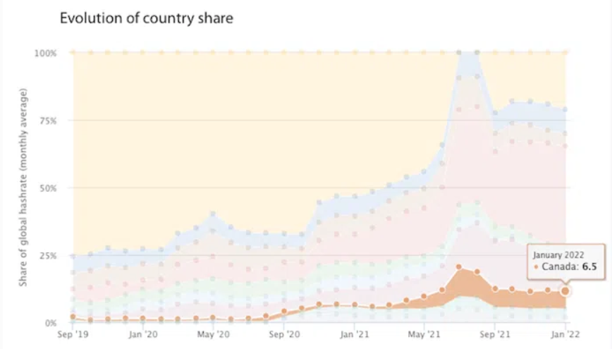 Au contraire, au cours de la même période, le Canada a considérablement augmenté sa contribution au hashrate mondial. De 1,6% le 21 mars 2021 à 6,5% le 22 janvier 2022.