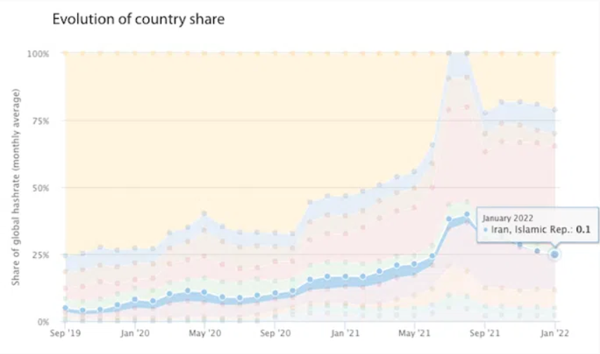 L’Iran dispose d’un réseau basé à 98 % sur les combustibles fossiles. Selon l’Université de Cambridge, presque toutes les activités minières y ont cessé (il est passé de 4,7% au 21 mars 2021 à 0,1% au 22 janvier 2022).