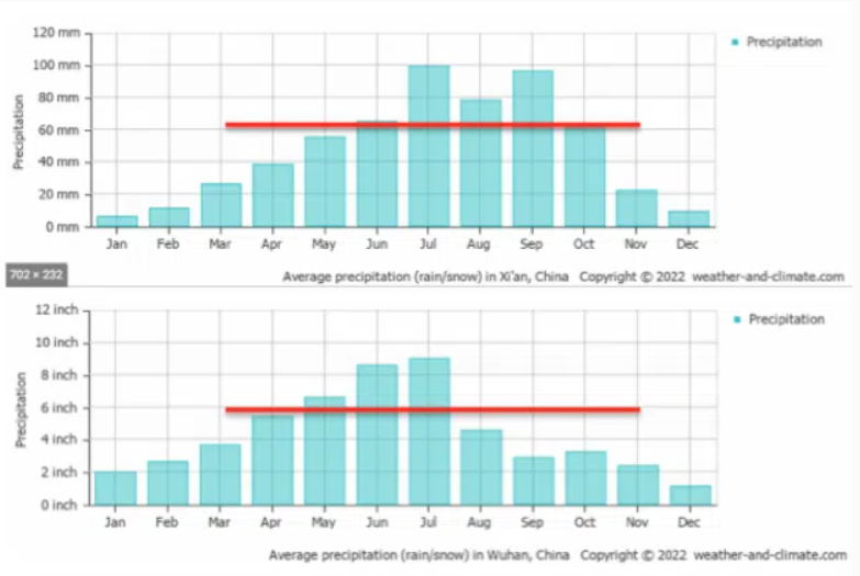 Voici les graphiques où l’on voit que dans diverses régions de Chine ; on observe un schéma constant de très fortes précipitations sur une période d’environ 3 mois.