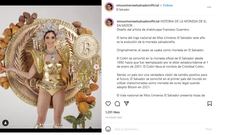 Le Salvador a de nouveau fait part de son amour pour les crypto-monnaies. Au concours de Miss Univers 2023, la représentante du pays a montré un “costume typique” du pays arborant les différentes monnaies du pays et revêtant également la dernière en date : Bitcoin.