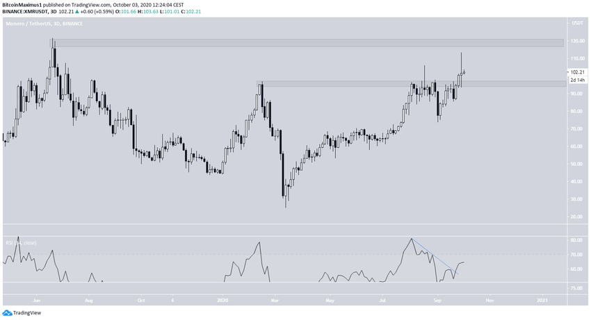 Le cours du XMR évolue au-dessus de l’ancienne résistance des 96 dollars. Cette dernière a précédemment rejeté quatre tentatives de traversée. Le cours l’a finalement validée comme support et se prépare maintenant pour la prochaine résistance, située à 119$.